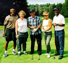 The OICW Celebrity Golf Championship was another smashing success again this year. This year, the event was hosted by Jan Hutchins (left). In addition, Father Sweeney (center) set the pace with an impressive set of strokes.